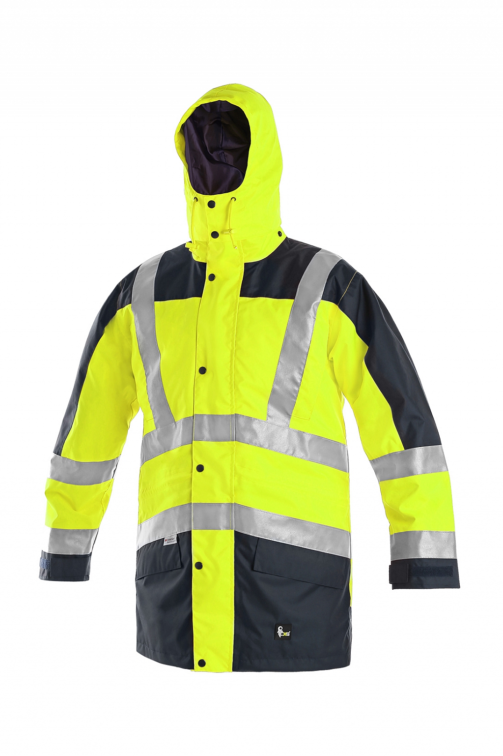 Pánská výstražná bunda 5 v 1 s odnímatelnou vnitřní bundou, odolná proti vodě a větru, 3M reflexní pruhy, lepené švy. Vnější bunda: 2 spodní kapsy s patkou, 2 náprsní kapsy, zip krytý légou zapínanou na druky, kapuce v límci, regulovatelné manžety na suchý zip. Možnost regulace velikosti v pase i v dolní části bundy. Vnitřní kapsy: na pravé straně kapsa na mobil, na levé straně větší kapsa na peněženku. Vnitřní bunda s odepínacími fleecovými rukávy, 2 boční kapsy kryté patkou na suchý zip, vnitřní kapsa na levé straně. Doporučené použití: stavebnictví, silničáři, řidiči, logistika, údržba, policie, záchranáři.