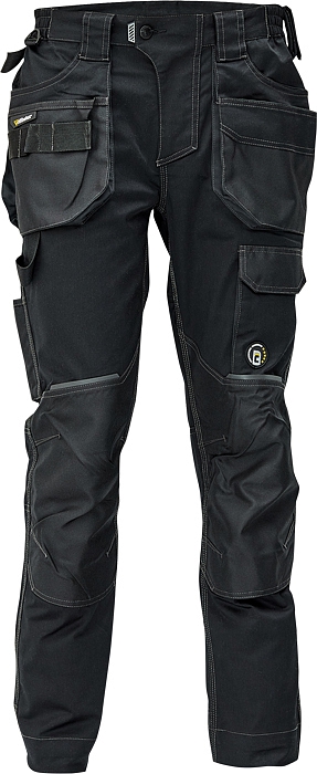 pánské pracovní kalhoty, elastický inovativní materiál TRIFIBETEX®, ergonomický střih, snížený pružný pas, odolné trojité prošití nohavic a sedu, zesílená oblast kolen s možností vkládání kolenních výztuh, prostorné multifunkční přední kapsy s poutky na nářadí, 2 zadní kapsy s klopou zesílené Oxfordem, stehenní kapsa na telefon s klopou a zapínáním na suchý zip, kapsa na metr a nůž, poutko na kladivo, "D" kroužek, poutko na nářadí v pase, originální zpracování zapínání kalhot, reflektivní prvky v barevném odstínu, nastavitelná délka nohavic