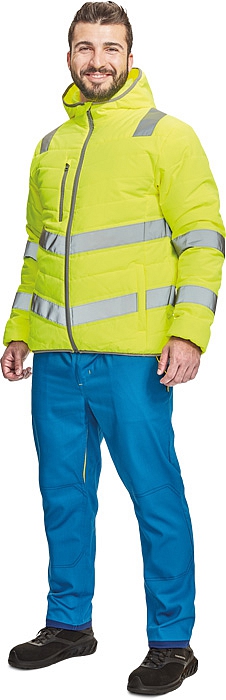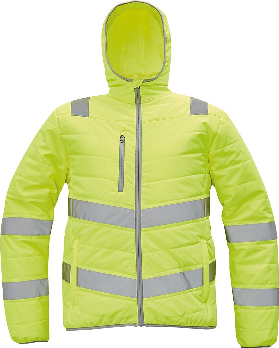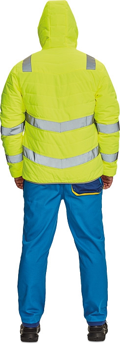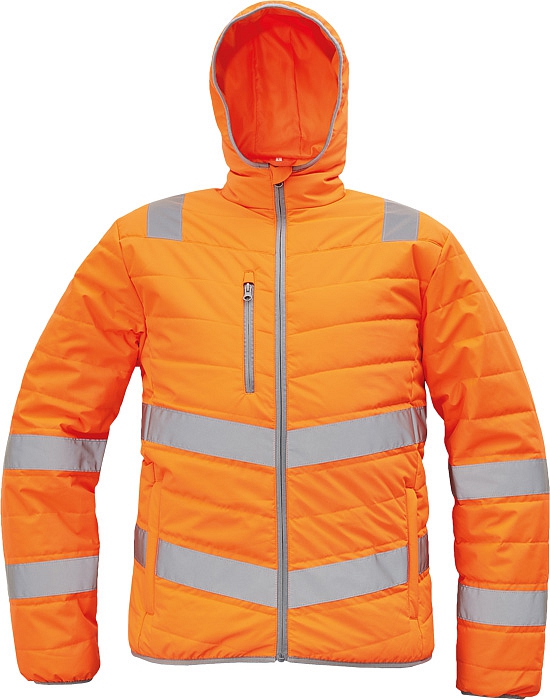 pánská zateplená zimní bunda s HI-VIS reflektivními pruhy a kapucí, 2 boční kapsy na zip, 1 hrudní kapsa na zip, 1 vnitřní kapsa na zip, elastické paspulky na obvodu rukávu, kapuce a a spodního lemu