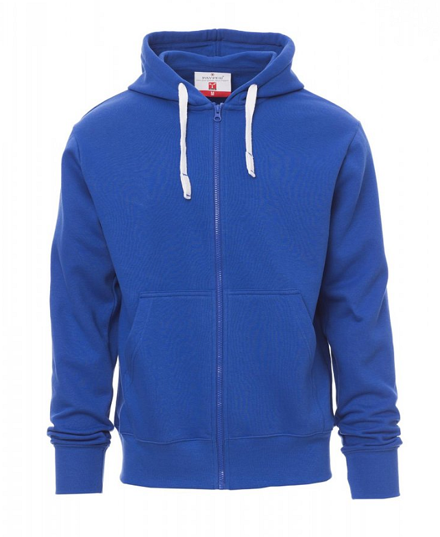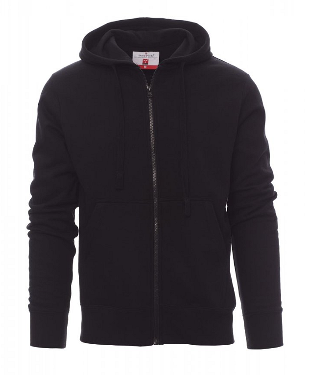 Pánská mikina s kapucí s plastovým skrytým celozipem s jedním kovovým jezdcem, kapuce, stahovací šňůrka s barevně sladěným prošitím, všívané rukávy, klokaní kapsa, manžety a pas s elastickým žebrováním, zesílené švy. Vyztužená páska sladěné barvy na vnitřní straně krku.