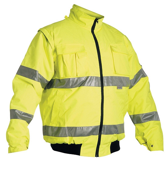 pánská HI-VIS zimní nepromokavá bunda s odepínatelnými rukávy; kapuce integrovaná v límci, prodyšná, podlepené švy; 3M reflexní pruhy okolo pasu a rukávů; 2 boční kapsy, 2 náprsní kapsy, 1 malá kapsa na levém rukávu; nastavitelná šířka rukávů pomocí druků; elastický pas.