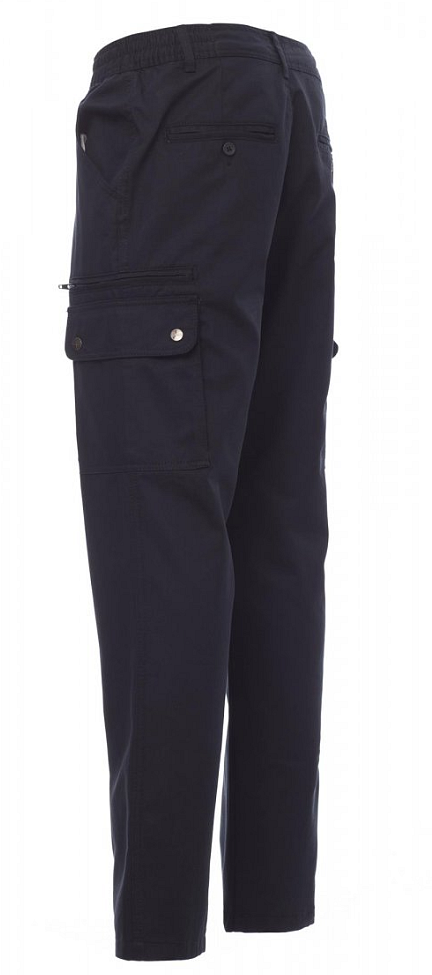 Pánské kalhoty, celoroční, elastické pásky na bocích a poutka v pase, zapínání na zip a na kovový knoflík, dvě přední kapsy klasického střihu, dvě postranní kapsy s klopou a druky, jedna kapsa na zip po levé straně, skrytá kapsa na svinovací metr po pravé straně, dvě zadní prostřižené kapsy s knoflíkovou dírkou a knoflíkem.