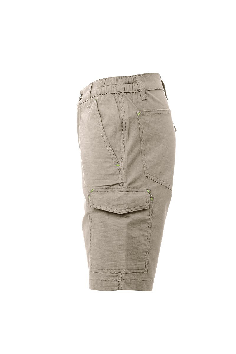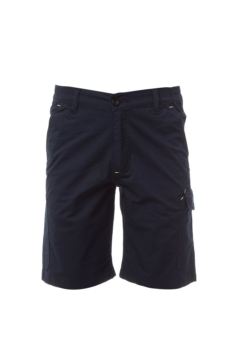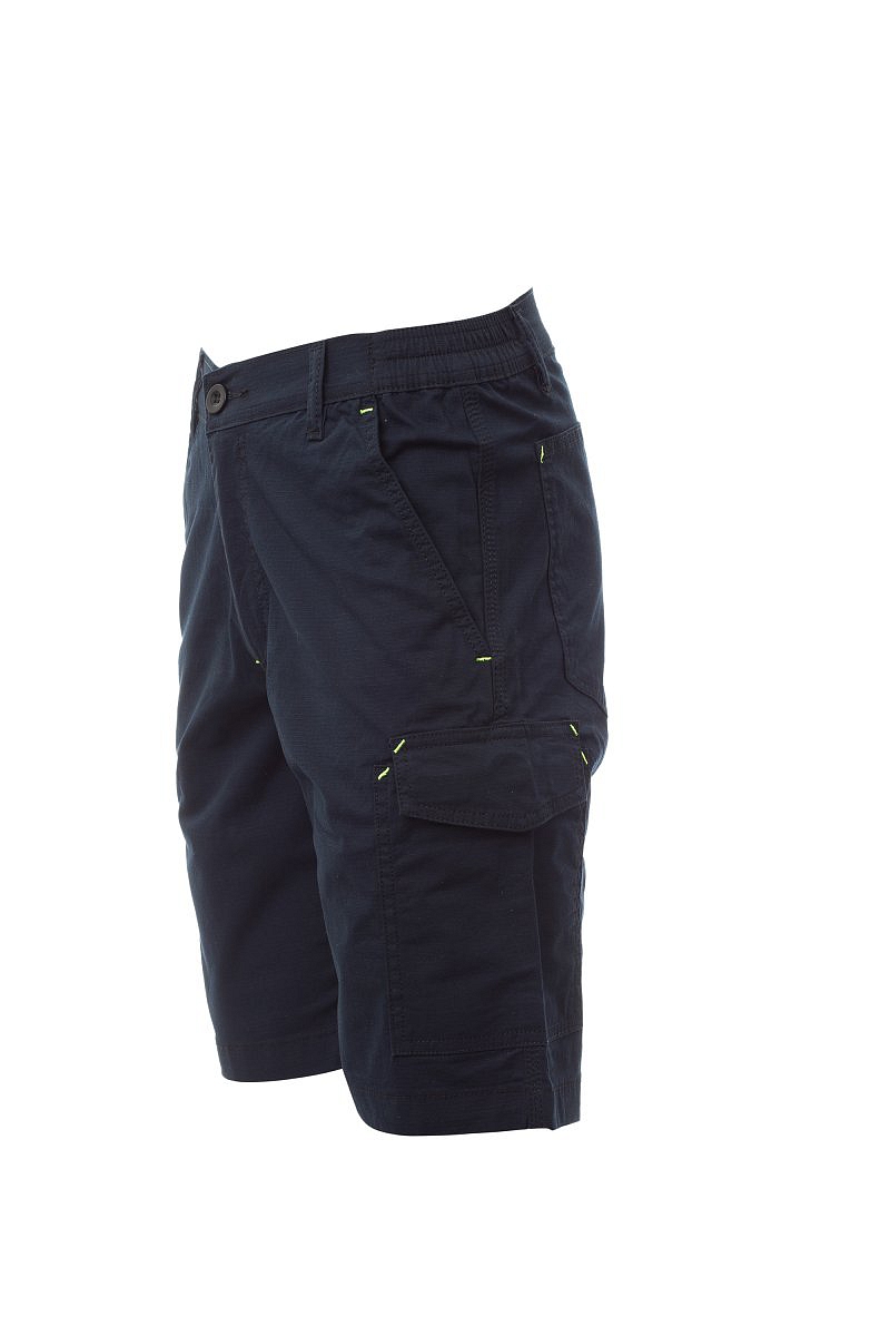 Bermudy ze strečové ripstopové tkaniny, lehké, s poutky a elastickým páskem v pase, zapínání na zip s klopou a knoflíkem na pásku. Přední kapsy klasického střihu, kapsička na mince v pravé kapse při nošení a boční kapsa na svinovací metr. Levá postranní kapsa s uzavírací klopou LOCK SYSTEM. Dvě zadní kapsy, z nichž jedna s klopou na suchý zip. Prošití trojjehlou.