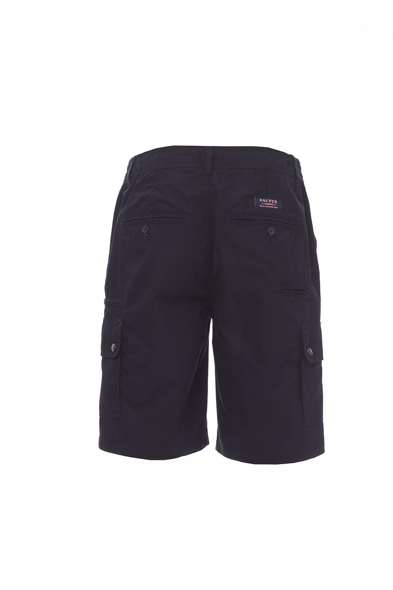 Pánské bermudy, elastické pásky na bocích a poutka v pase, zapínání na zip a na kovový knoflík, dvě přední kapsy klasického střihu, dvě postranní kapsy s klopou a druky, jedna kapsa na zip po levé straně, skrytá kapsa na svinovací metr po pravé straně, dvě zadní prostřižené kapsy s knoflíkovou dírkou a knoflíkem.