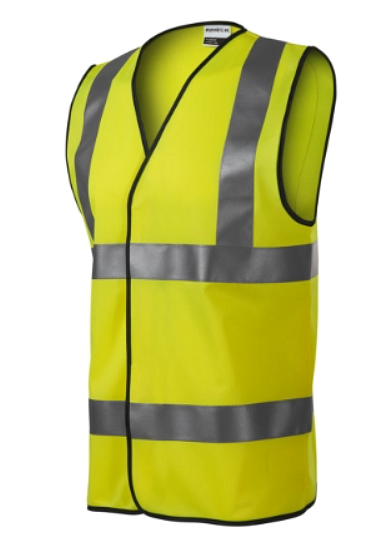 - Osnovní pletenina, fluorescenční 100% polyester, retroreflexní pásy Silver Fabric DM D1002, 100 % polyester, certifikovaný materiál splňující normované požadavky na oděvy třídy 2