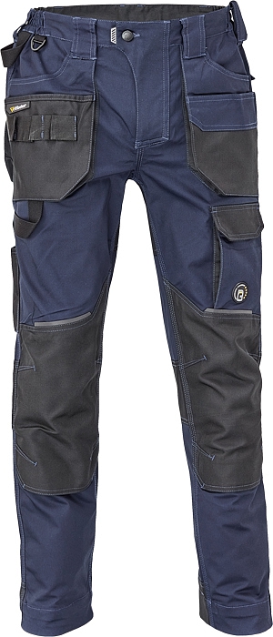 pánské pracovní kalhoty, elastický inovativní materiál TRIFIBETEX®, ergonomický střih, snížený pružný pas, odolné trojité prošití nohavic a sedu, zesílená oblast kolen s možností vkládání kolenních výztuh, prostorné multifunkční přední kapsy s poutky na nářadí, 2 zadní kapsy s klopou zesílené Oxfordem, stehenní kapsa na telefon s klopou a zapínáním na suchý zip, kapsa na metr a nůž, poutko na kladivo, "D" kroužek, poutko na nářadí v pase, originální zpracování zapínání kalhot, reflektivní prvky v barevném odstínu, nastavitelná délka nohavic