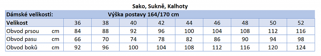 Tabulka Velikostí: Dámská saka, sukně, kalhoty
