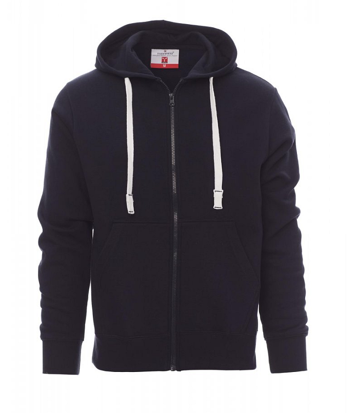 Pánská mikina s kapucí s plastovým skrytým celozipem s jedním kovovým jezdcem, kapuce, stahovací šňůrka s barevně sladěným prošitím, všívané rukávy, klokaní kapsa, manžety a pas s elastickým žebrováním, zesílené švy. Vyztužená páska sladěné barvy na vnitřní straně krku.
