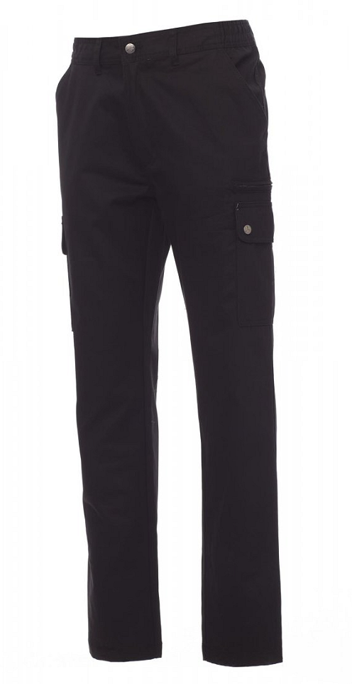Pánské kalhoty, celoroční, elastické pásky na bocích a poutka v pase, zapínání na zip a na kovový knoflík, dvě přední kapsy klasického střihu, dvě postranní kapsy s klopou a druky, jedna kapsa na zip po levé straně, skrytá kapsa na svinovací metr po pravé straně, dvě zadní prostřižené kapsy s knoflíkovou dírkou a knoflíkem.
