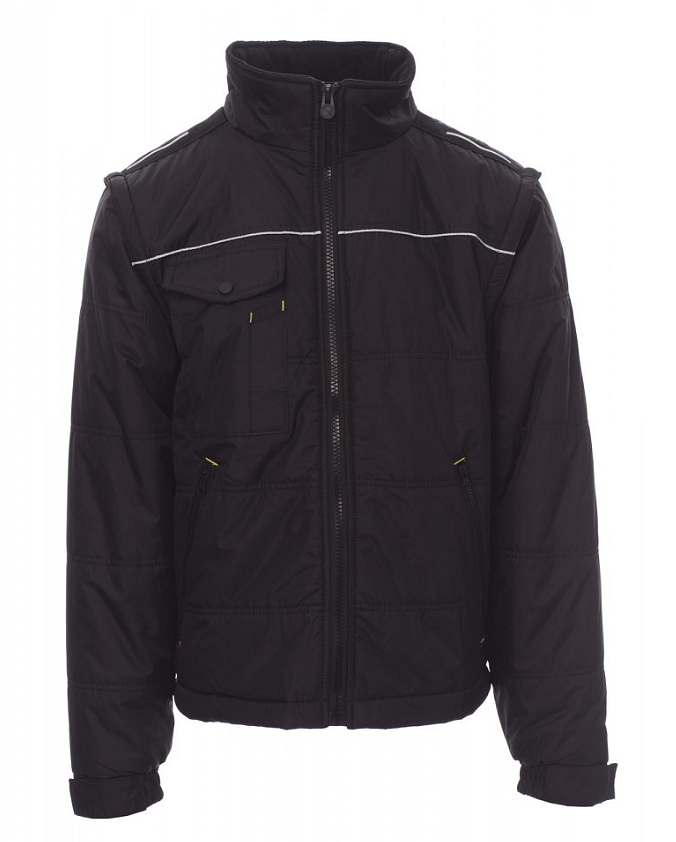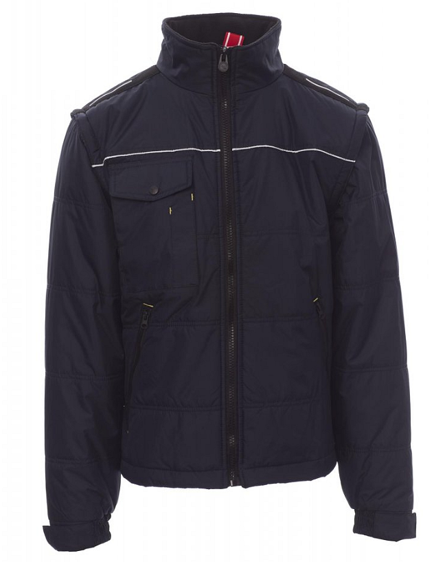 Pánská lehká bunda s odepínacími rukávy, tvarovaná záda, 8mm plastový zip s kovovým jezdcem, dvě velké vnější kapsy na zip, kapuce v límci, velká kapsa na hrudi na smartphone a upínací kroužek na jmenovku, reflexní lemování na hrudi a na zádech. Vnitřek: zateplení, prošívaný materiál podšívky s vysokou hustotou, flísový vnitřek límce, jedna kapsa.