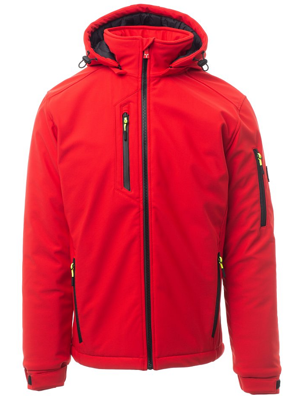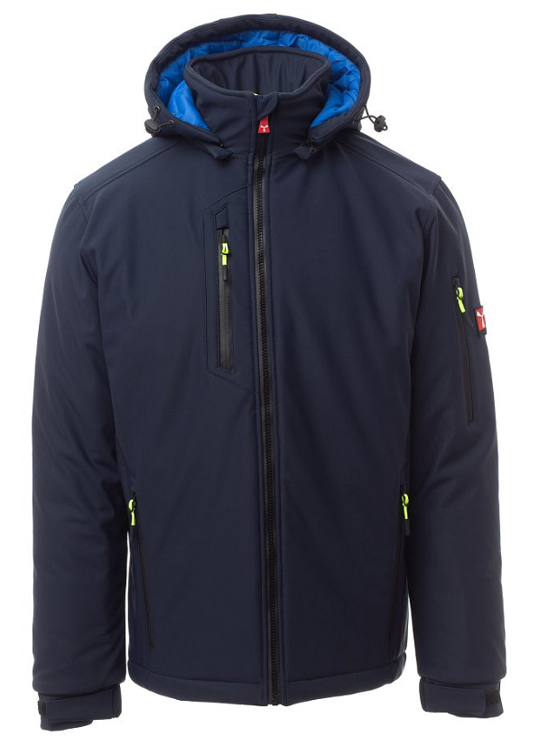 WP 8000 mm H₂O, WVT 5000 g/m² 24h. Pánský zateplený softshell, zapínání na zip SBS s kovovým jezdcem „semi-auto lock“ a přizpůsobeným taháčkem. Odnímatelná kapuce se stahovací šňůrkou. Vnitřní límec s flísovými bočními prvky. Reflexní pruhy na zádech a zadní straně kapuce. Elastické stahovací manžety na suchý zip. Dvě boční kapsy na zip, jedna kapsa na hrudi s voděodolným zipem a jedna kapsa na levé paži s integrovaným očkem na pero na zip. Fluorescentní taháčky. Jedna vnitřní prostřižená kapsa na suchý zip. Spodní část stažitelná pomocí přizpůsobených zarážek.
