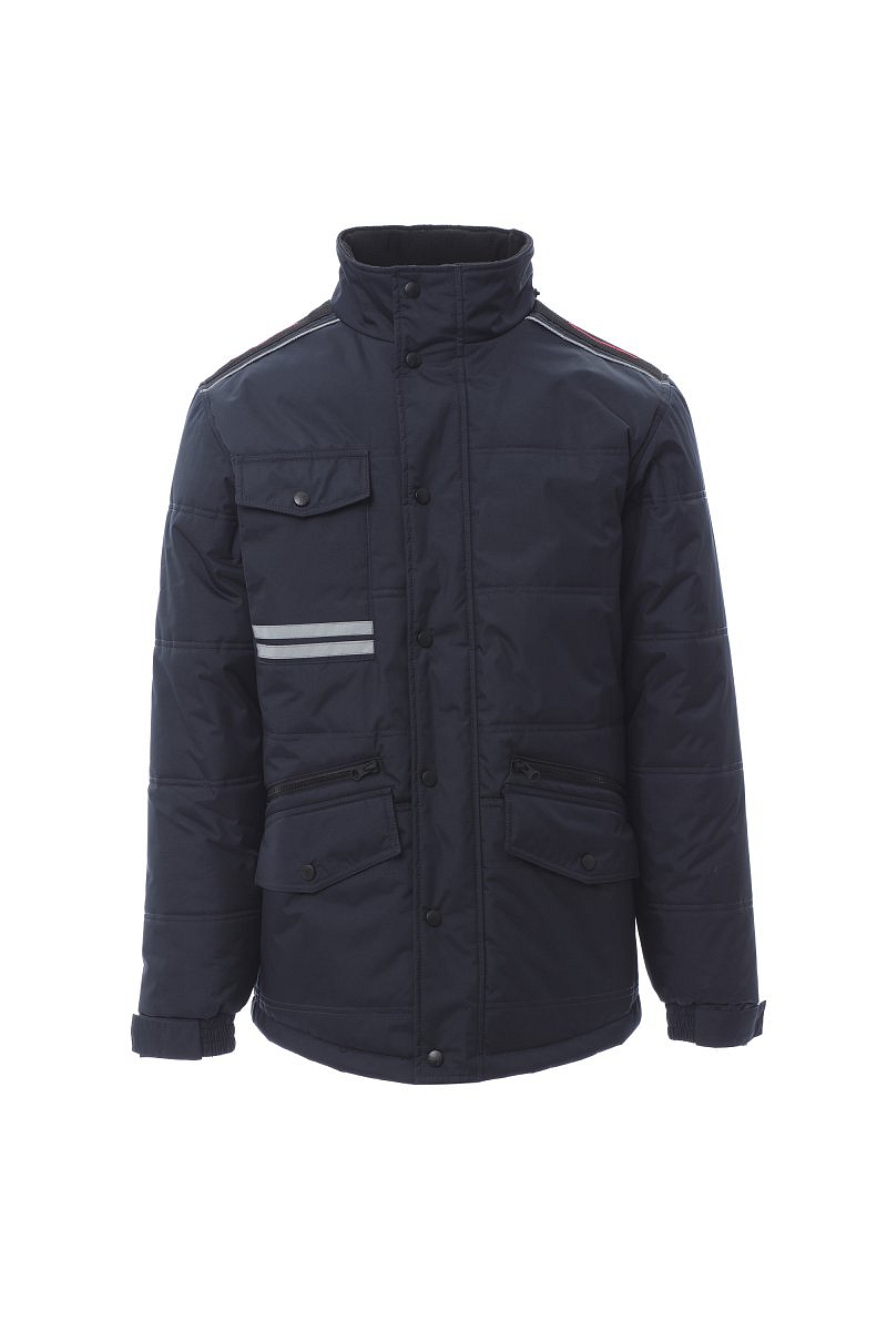 Tříčtvrteční pánská bunda s 8mm plastovým zipem s kovovým jezdcem zakrytým klopou a s plastovými knoflíky, tvarovaná zadní část s kapucí v límci, dvě vnější kapsy s LOCK SYSTEMem, dvě kapsy na zip, šikmé kapsy pro lepší přístup, jedna kapsa na hrudi na smartphone a upínací kroužek na jmenovku, reflexní pruhy na kapse a na zádech. Vnitřek: zateplení, kontrastní flísový lem na zádech a límci, jedna vnitřní kapsa, vnitřní zip pro snadnější potisk a vyšívání.