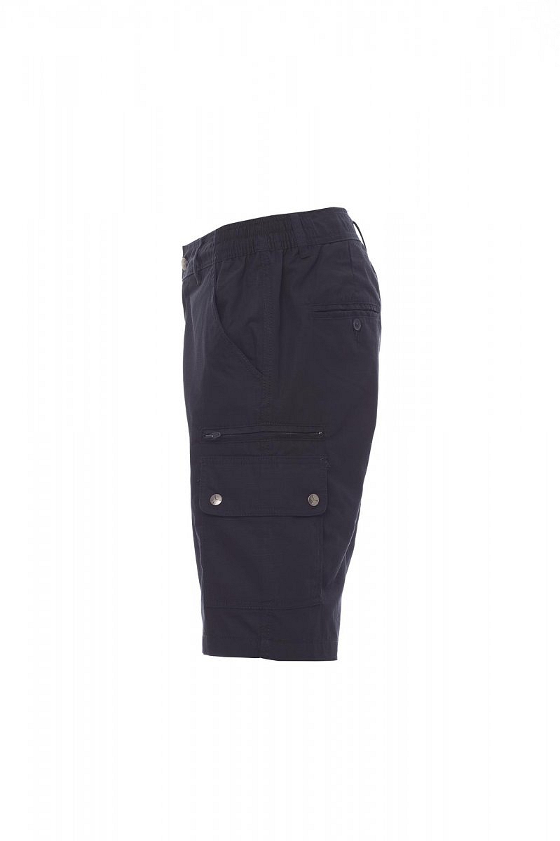 Pánské bermudy, elastické pásky na bocích a poutka v pase, zapínání na zip a na kovový knoflík, dvě přední kapsy klasického střihu, dvě postranní kapsy s klopou a druky, jedna kapsa na zip po levé straně, skrytá kapsa na svinovací metr po pravé straně, dvě zadní prostřižené kapsy s knoflíkovou dírkou a knoflíkem.
