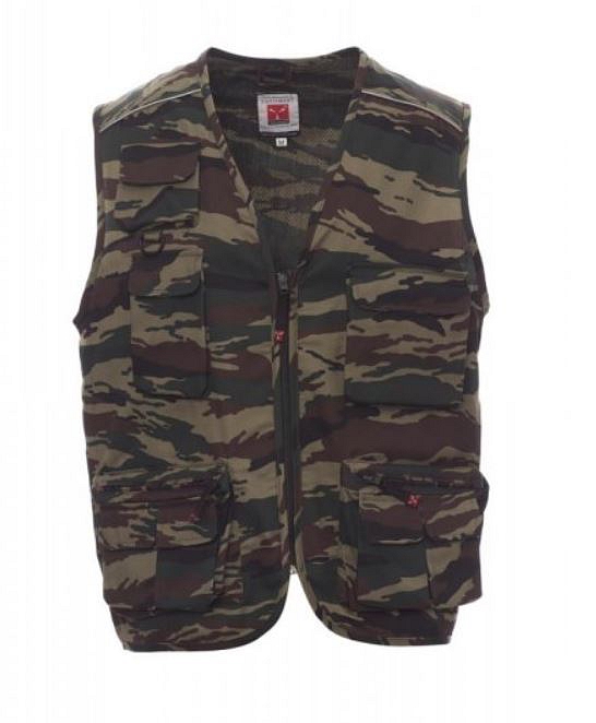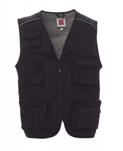 Letní vesta, zip, systém předních víceúčelových kapes s oboustranným pouzdrem na jmenovku, reflexní lemování na ramenou a na zádech, velká lovecká kapsa na zádech. Vnitřek: zátěr dry-tech v kontrastní barvě, rozepnutá pro snadnější potisk a vyšívání.